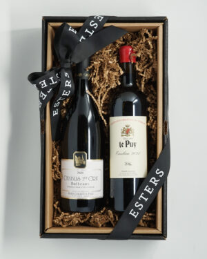 A gift for the serious wine lover, we’ve picked these two bottles from our extensive cellar. These are hard to find, special cuvées from off the beaten path wrapped in a black/kraft box with crinkle paper and Esters’ ribbon.
