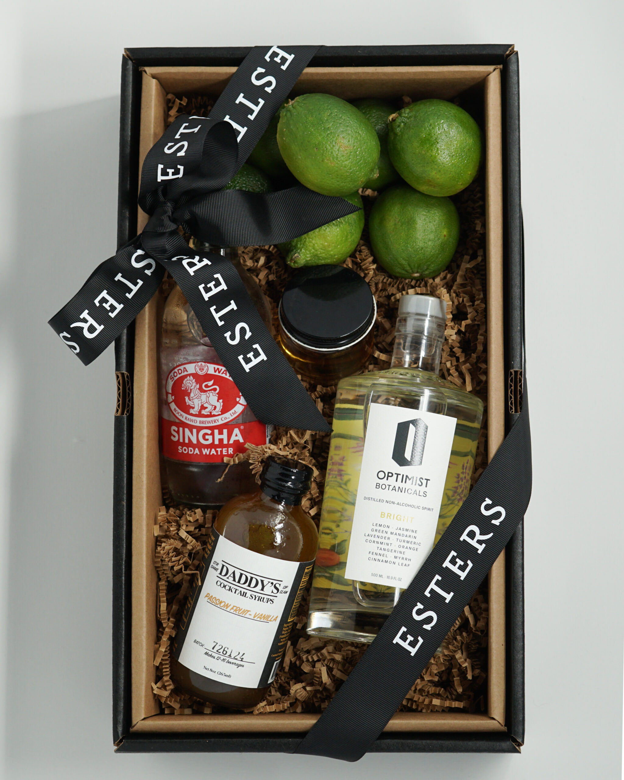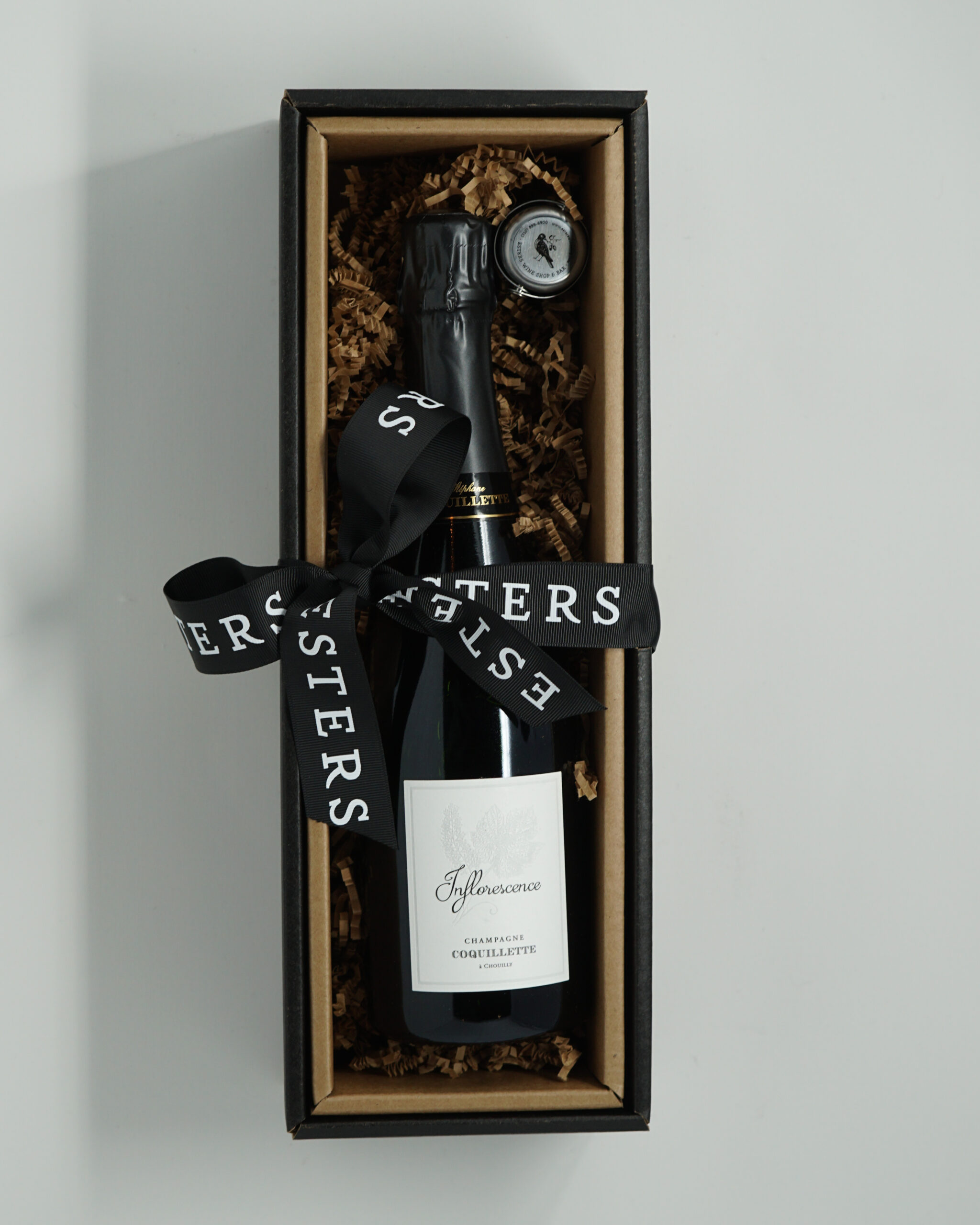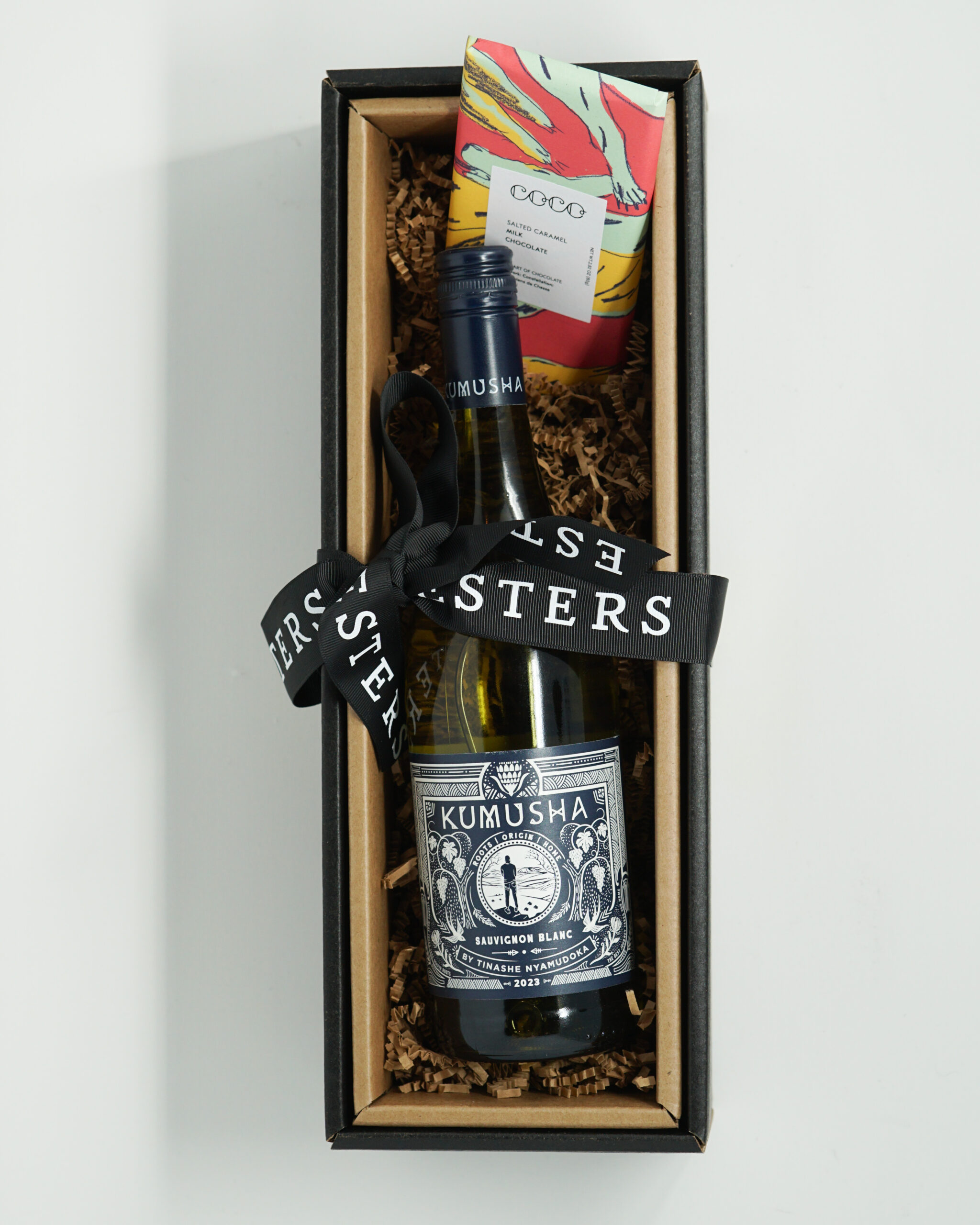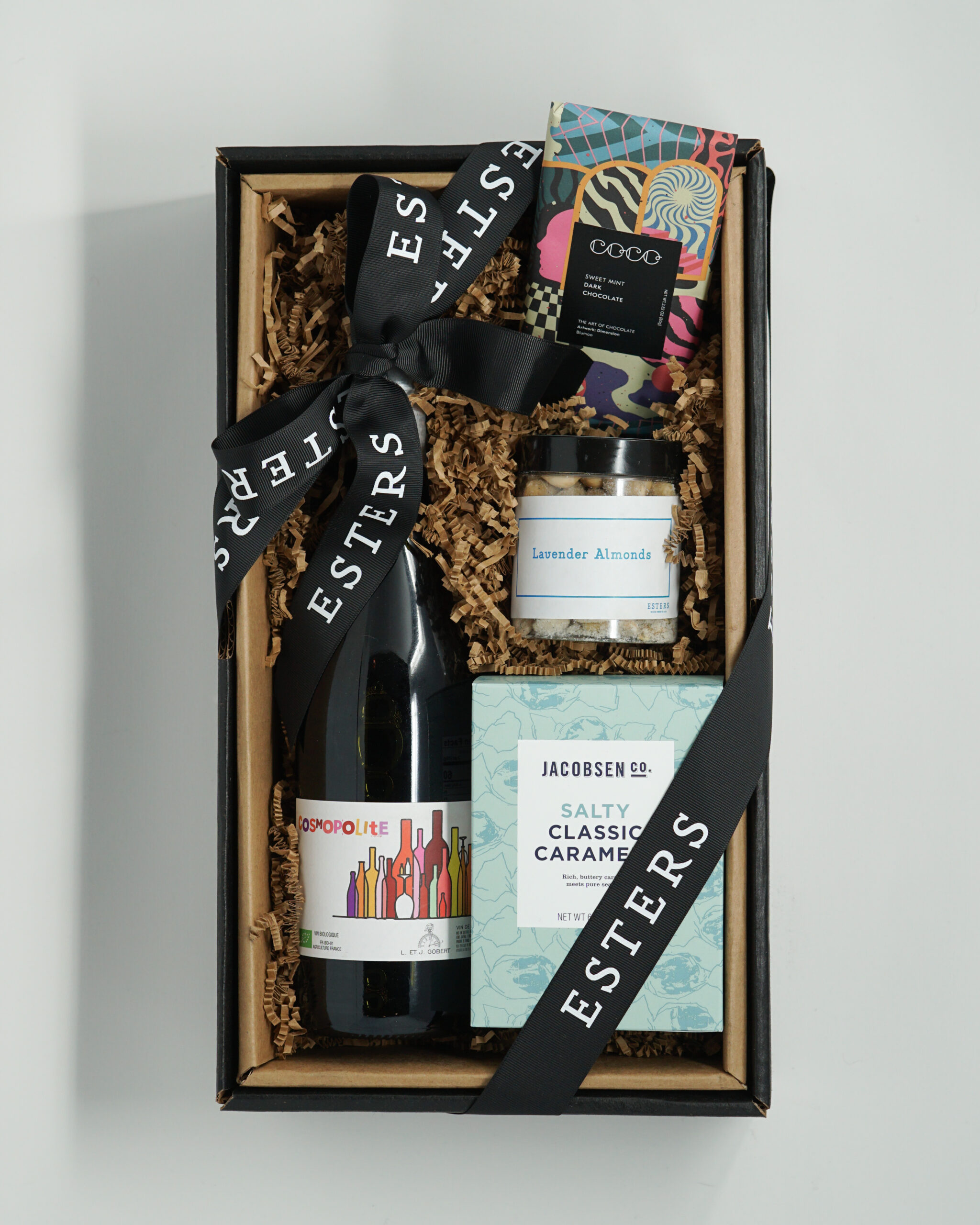 All anyone really wants is wine and chocolate – the perfect combo for chilling on a Thursday night at home.  You choose your kind of wine, we’ll throw in an artisanal chocolate bar and wrap it up in a black/kraft box, with crinkle paper and Esters’ ribbon.